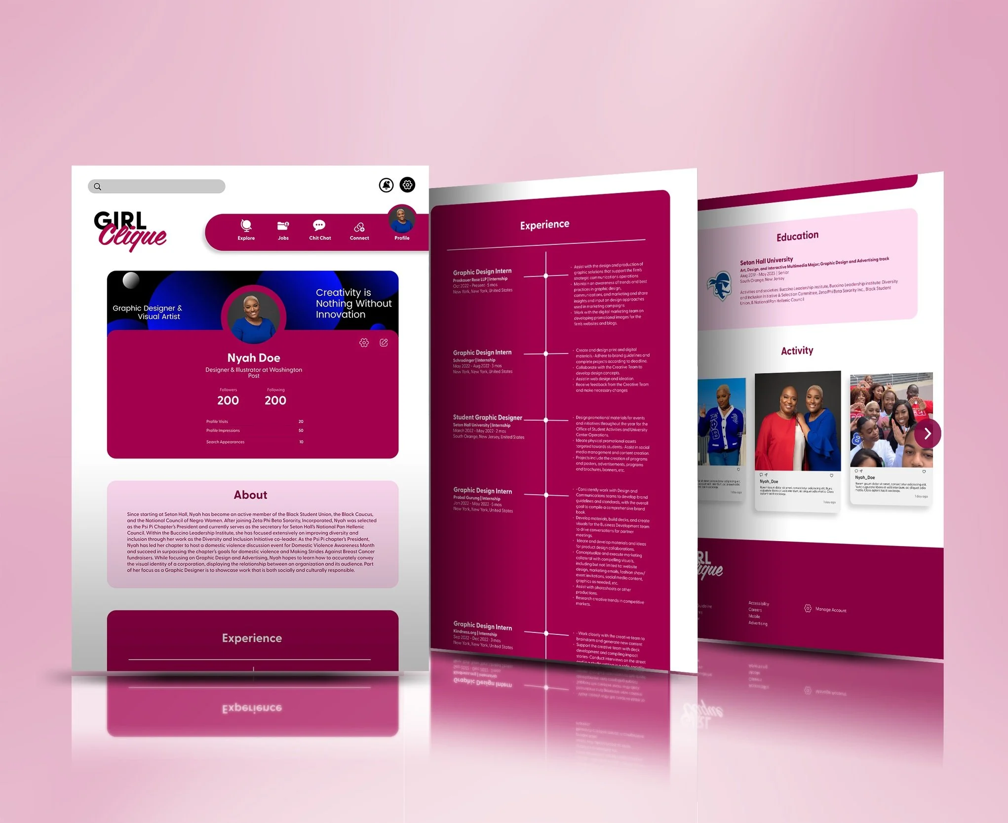 Girl Clique is a social media platform created by women for women. The platform is meant to be a networking and social app for career women. Users are able to share their resumes and work experience on their profiles. Companies can post jobs and articles. users are able to chat and schedule video meetings within the app. There is an explore page that offers video training, podcasts, and learning courses.